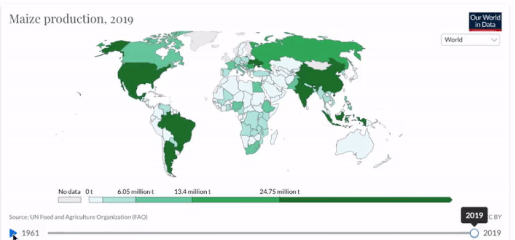 O mundo produz, por ano, 1,2 bilhão de toneladas de milho, mais que qualquer outro grão. 35% dessa produção vem dos Estados Unidos, que são o maior produtor, consumidor e exportador de milho. Outros 20% vêm da China, e o Brasil é o 3º maior produtor, com 120 milhões de toneladas, o que equivale a 10% do milho produzido no mundo, seguido da Argentina, com cerca de metade da produção brasileira.